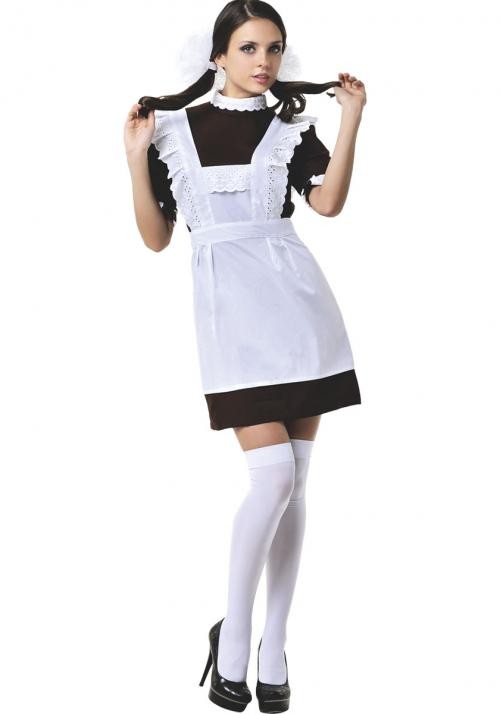 Комплект состоит из классического коричневого платья с белым воротничком и белоснежного фартука!