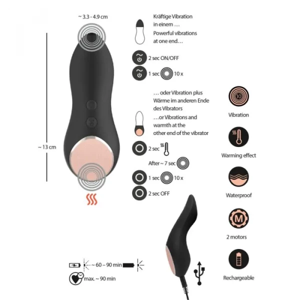 Форма вибратора максимально анатомична и идеальна даже для длительного ношения в трусиках! Выступы на вибраторе создадут дополнительное давление на клитор и вульву, что значительно увеличит градус возбуждения! Обратная сторона вибратора (ограничитель) имеет плоскую скошенную поверхность с твердым покрытием, которая нагревается до 50C! Идеально для стимуляции наружных эрогенных зон, в особенности клитора!